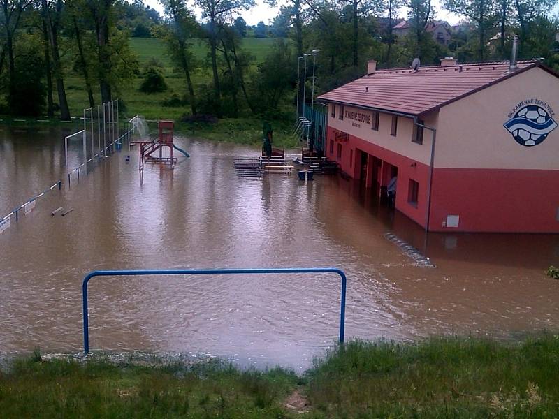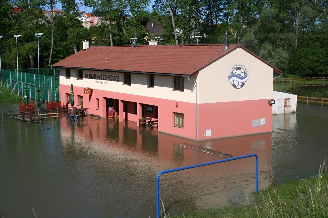Poslední větší povodně postihly Kamenné Žehrovice v důsledku rychlého tání v lednu roku 2011 a následně během intenzivních dešťů v červnu roku 2013. V zatopené oblasti byly postiženy budovy zajišťující nejen sportovně-rekreační funkce, ale sloužící i jako zázemí mateřské školky Kamínek, která byla nucena se přestěhovat do náhradních prostor v tzv. Dělnickém domě. Při povodni v minulých letech došlo k vytvoření rozsáhlé laguny, která sahala od začátku sportovního areálu až k samotným hranicím obce. Došlo k zatopení sportovního areálu, ale i doprovodné infrastruktury jako je dětské hřiště, příjezdové cesty atd. K menším rozlivům došlo při soutoku potoka Jordán a Loděnice, bylo zde materiálně poškozeno zahradnictví Franc.